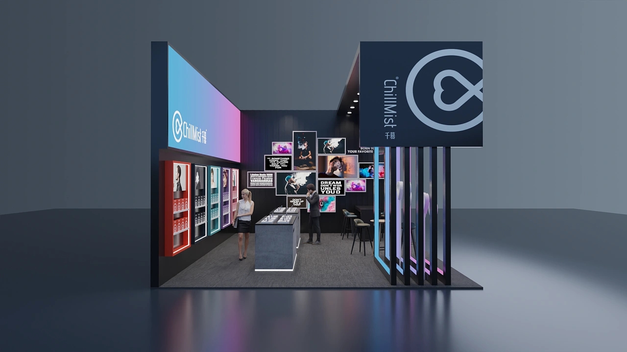 該展臺大小為56平,通過在黑色上粉藍色的漸變色彩打造展臺設計中的亮點,該展位展臺設計采用了兩面開的方式,其中一面墻上布置了錯落有致的畫框,用于展示企業的參展展品和企業價值觀,另一面墻排列了參展商的各類產品以及體驗臺,讓與會觀眾能更直觀體驗參展的產品,提高產品的成交量。整個展臺向參展觀眾展示了潮酷、現代的視覺感受。