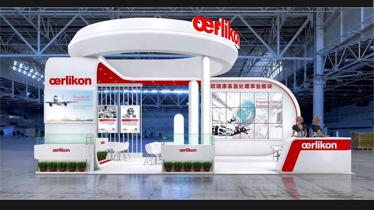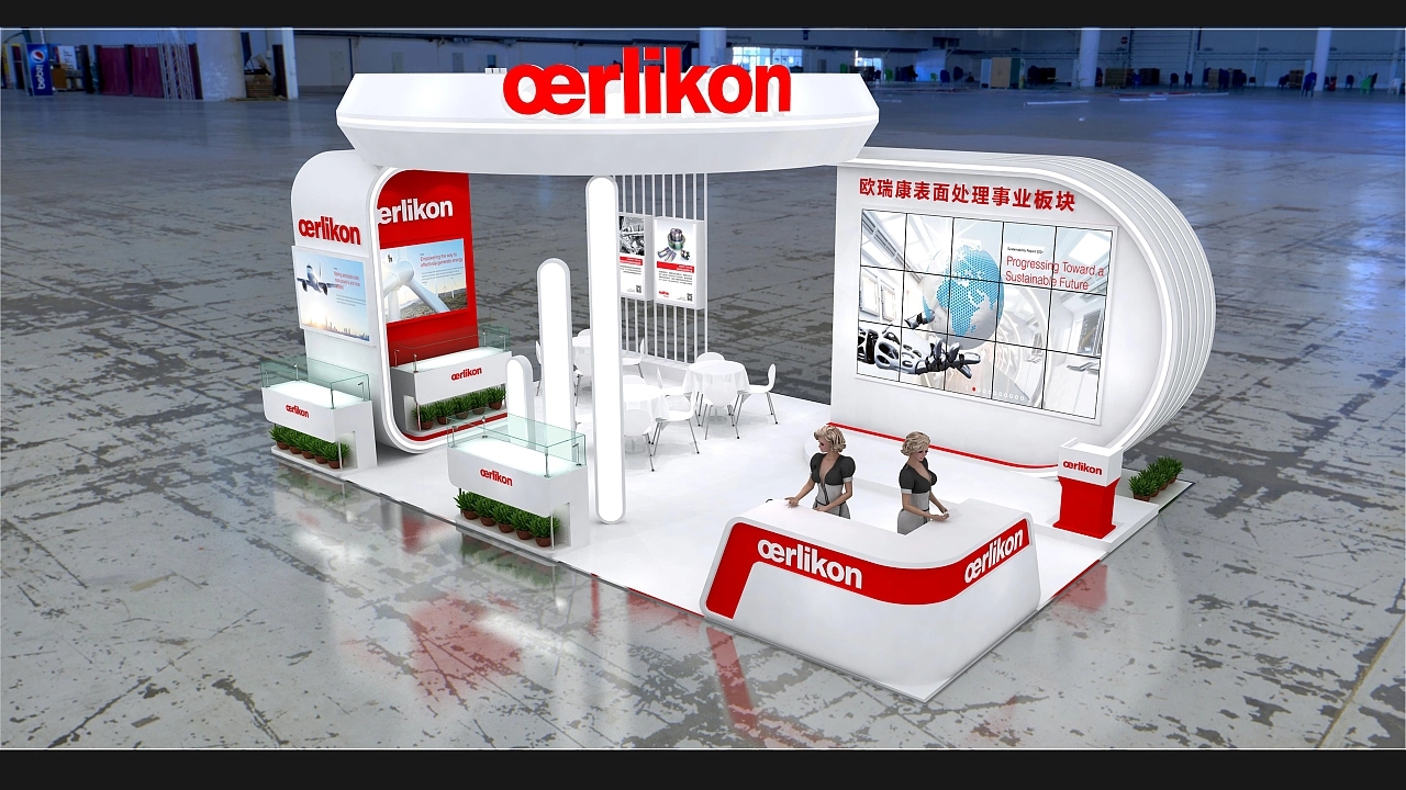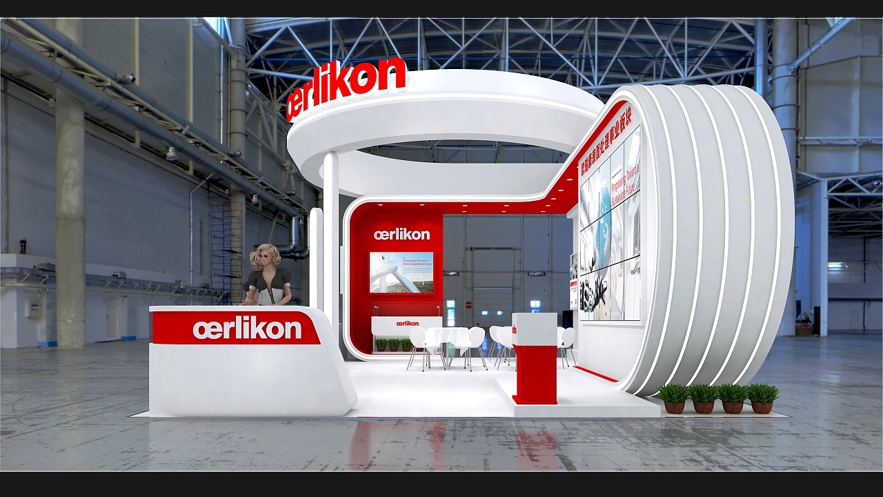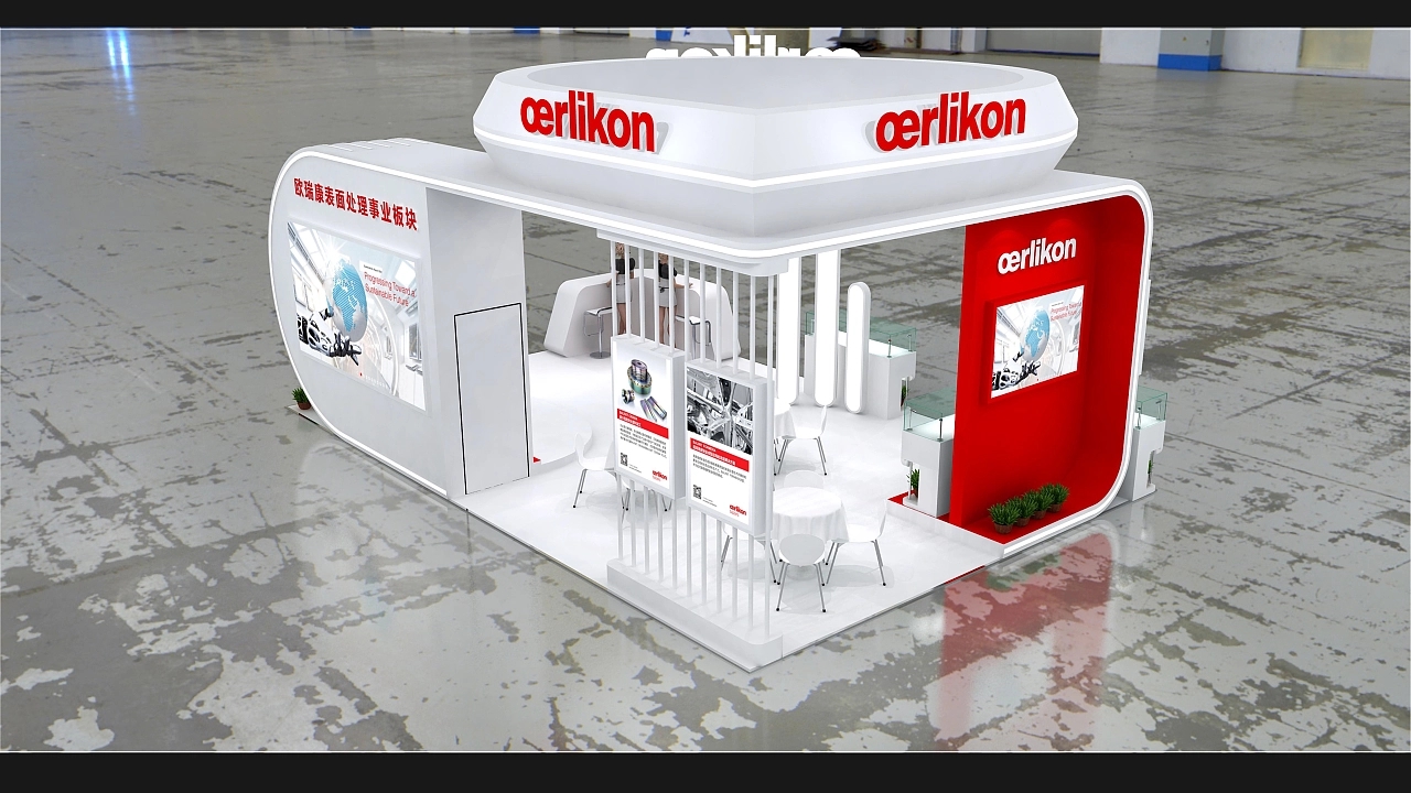 歐瑞康展臺設計以簡潔為主,用大量的白色作為底色,搭配上亮眼的紅色,起到吸引展會觀眾的作用。整個展臺設計的造型結合了企業產品的特性,在上方打造了一個特色的圓頂。整個展臺設計既簡潔大方,又不失企業特色,能更好的吸引會展人群,提高產品的成交額。