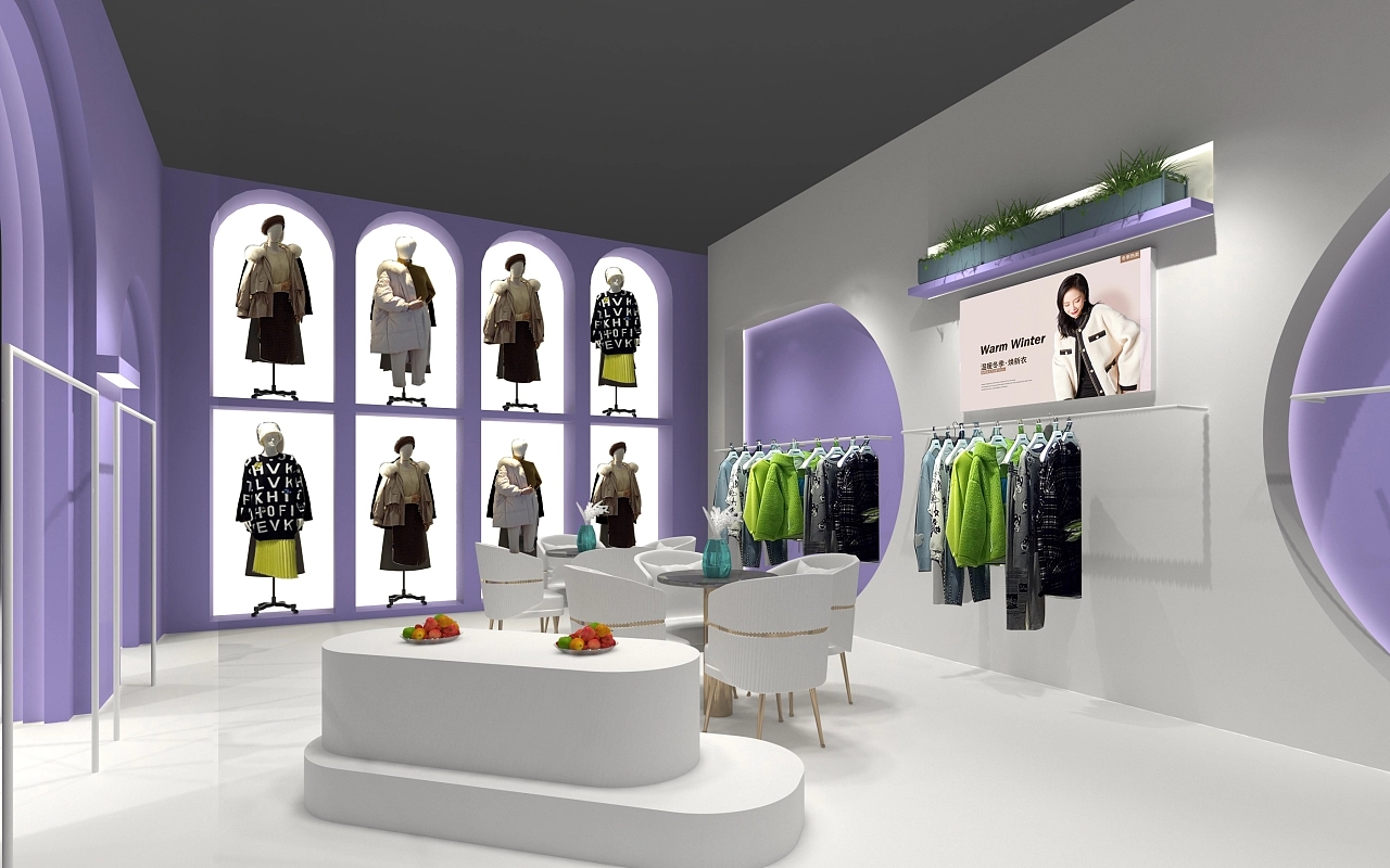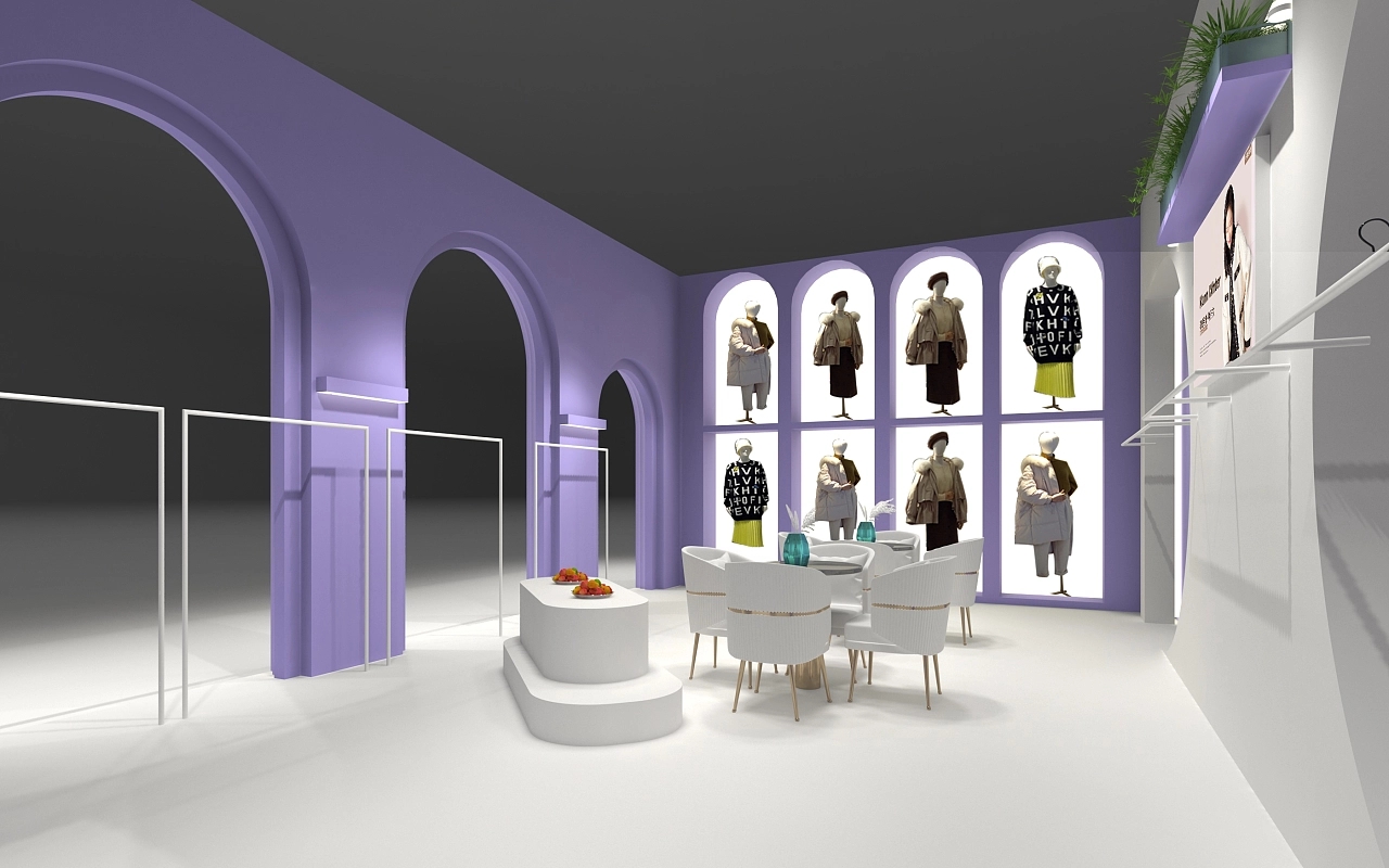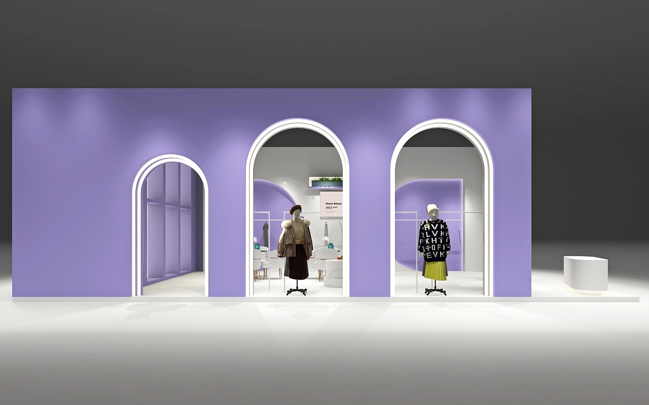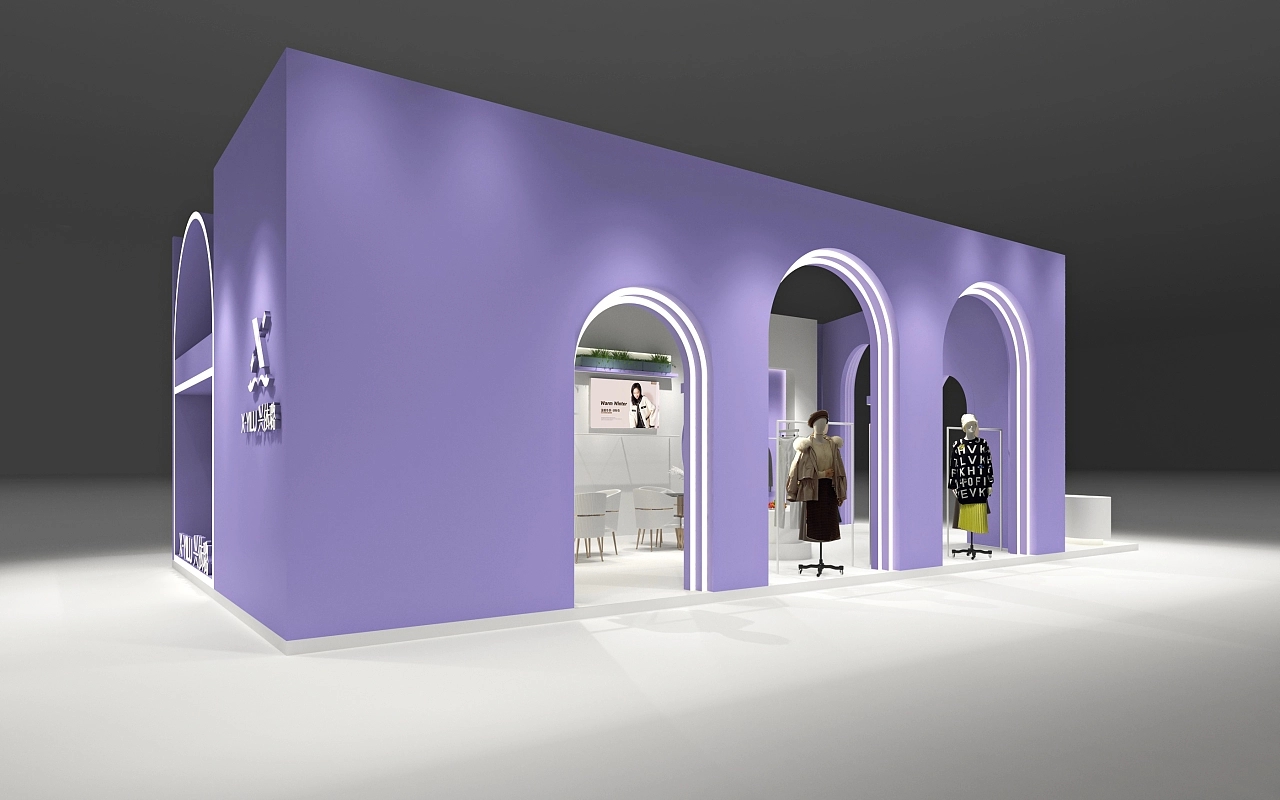 展臺設計搭建面積為72平方米,在造型上融合了歐式展臺的風格,在外墻部分使用了大小不一的圓形拱門,整個展臺以紫色作為主要色彩,體現出該展臺簡單時尚、典雅清幽的空間氛圍。展臺設計內部在一側面墻上搭建了內嵌的模特展示架,搭配燈光,使得會展觀眾能清晰直接的感受該企業服飾的優劣,促進訂單的成交。